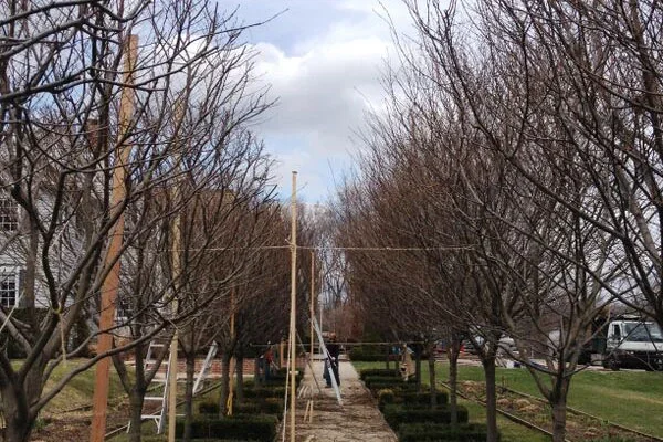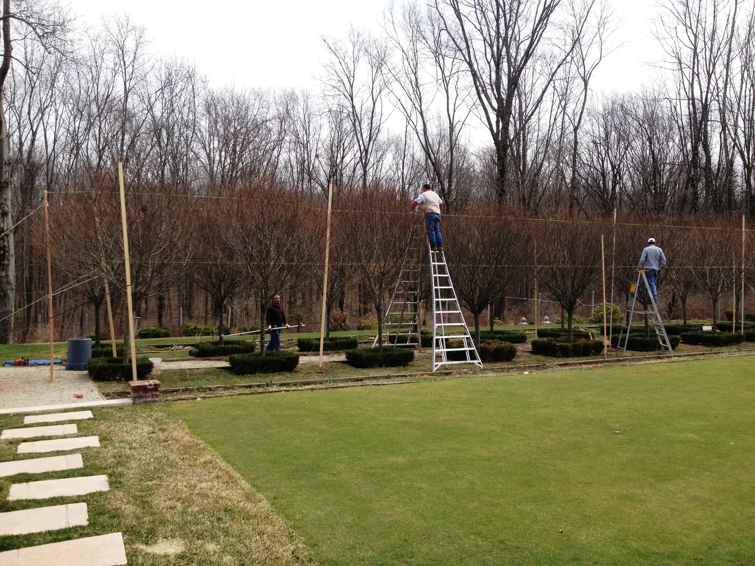 A woman in New Jersey saw a picture of two dozen hornbeams set in a double allée, pruned identically. She planted the trees, but had no idea how to prune them. That’s where we came in. We set up an elaborate, moving frame to allow us to turn twenty four trees into what she had imagined; a double allée of identical standards.